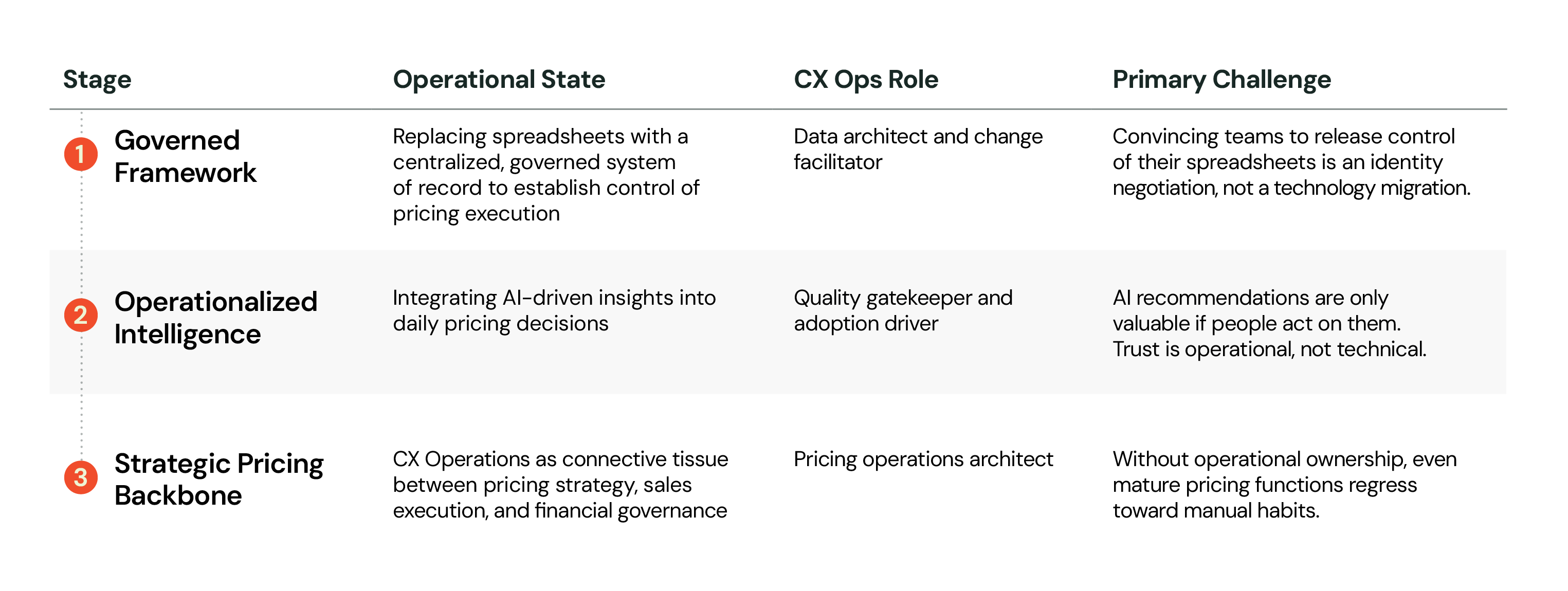 After working through multiple deployments across B2B manufacturing and distribution environments, I have observed a repeatable pattern in how organizations evolve their pricing capabilities. I call it the CX Ops Pricing Maturity Model, a three-stage framework that maps the transformation toward controlled pricing execution, not from the vendor’s perspective, but from the operations team responsible for making it work.